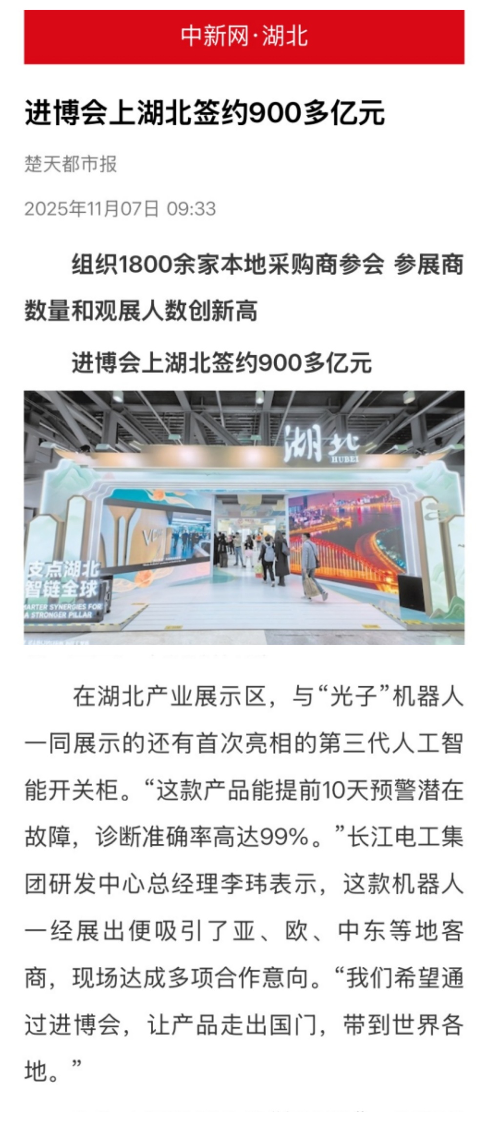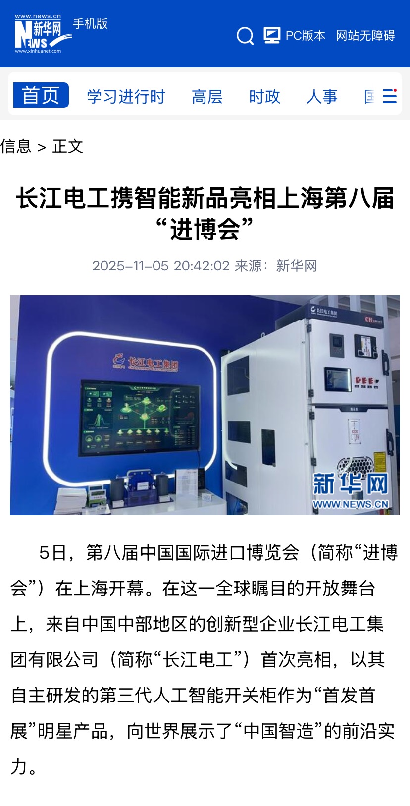 作為智能電網和新能源建設引領者,長江電工集團以“首發首展”的第三代人工智能開關柜為核心展品,攜多款自主研發成果首次亮相進博會,吸引包含中央廣播電視總臺新聞頻道、中央廣播電視總臺中文國際頻道、新華網、央廣網、中國新聞網、湖北日報、湖北電視臺等中央及省級媒體廣泛關注和聚焦報道。