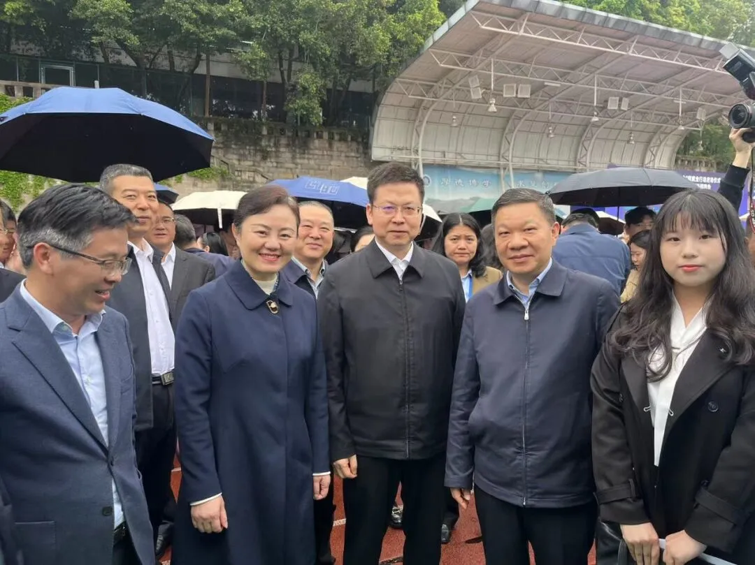 ▲招聘會現(xiàn)場合影:從左至右依次為,重慶工商大學(xué)黨委書記曾維倫,重慶市委常委、統(tǒng)戰(zhàn)部部長盧紅,全國工商聯(lián)副主席方光華,長江電氣黨委書記、董事長王新城,應(yīng)聘學(xué)子